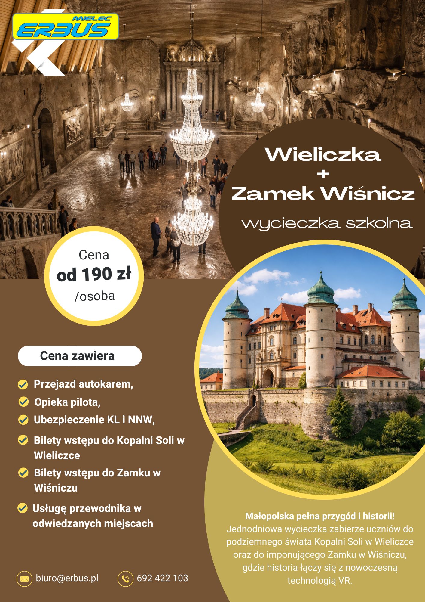W programie czeka niezwykła przygoda pod ziemią – zwiedzanie Kopalni Soli w Wieliczce. Trasa Górnicza prowadzi przez tajemniczy solny labirynt, umożliwiając uczestnikom poruszanie się śladami dawnych górników oraz poznanie historii wydobycia soli i fascynujących legend związanych z kopalnią. Kolejnym punktem wycieczki jest imponujący Zamek w Wiśniczu – największa po Wawelu rezydencja magnacka w Małopolsce. Zwiedzanie z przewodnikiem przybliży historię zamku, a nowoczesny Bastion VR zapewni wirtualną podróż w czasie, łącząc naukę z interaktywną zabawą.